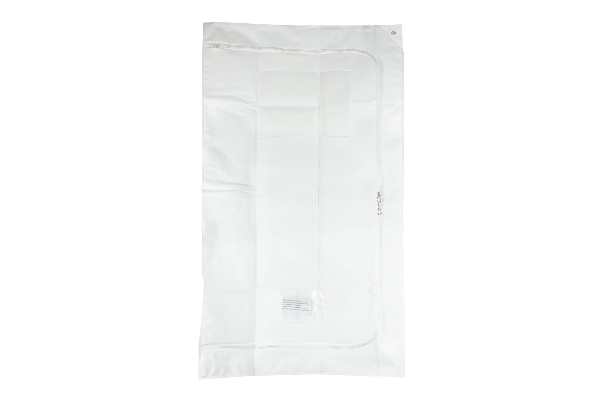 The Baby body bag is made from white PEVA heatsealed material (200 micron) with welded seams and a U-shaped zip opening. The product is fluid retentive and can accommodate a weight of up to 70kg. It also has a document pocket for notes/ID.