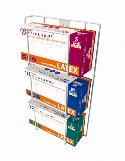 White coated wire triple glove box dispenser which can be wall mounted. Sold individually.